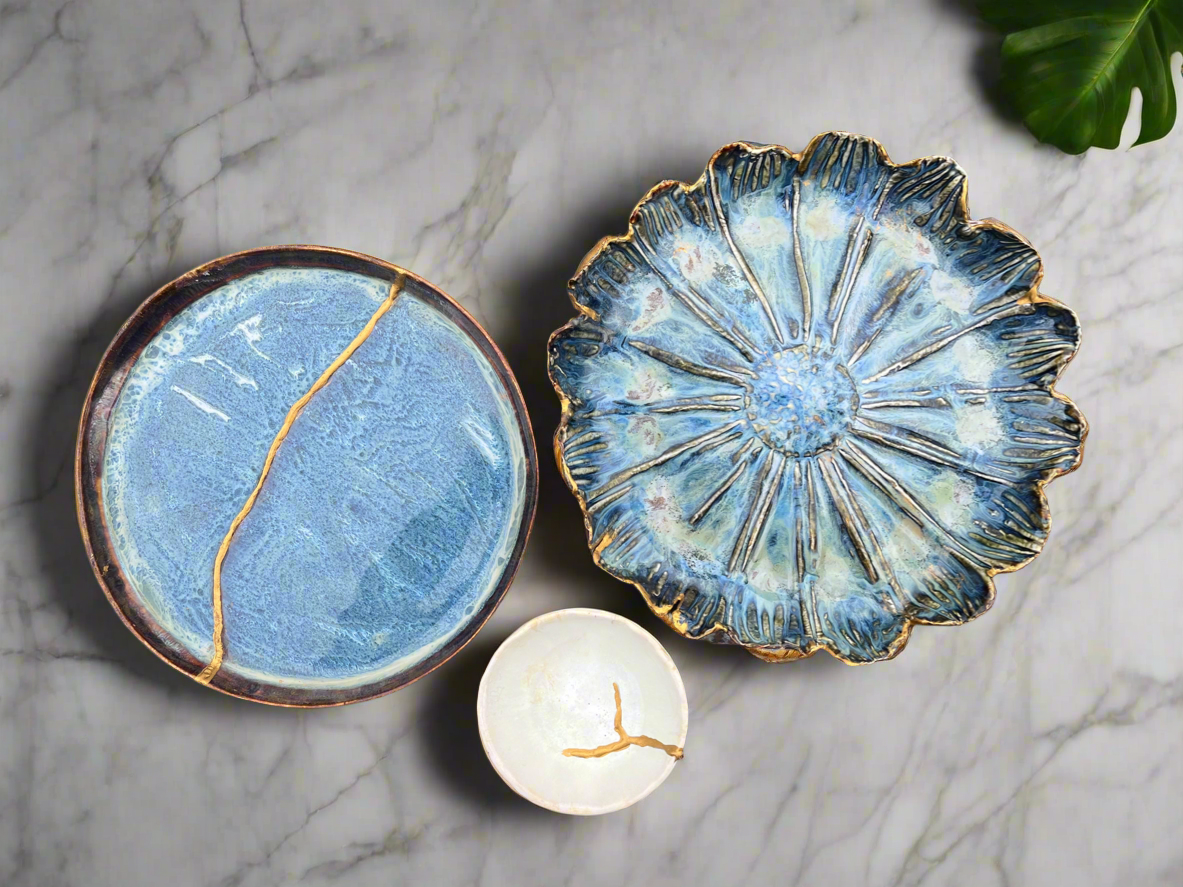 Extra large stoneware bowl - blue sgraffito with pearl white glaze